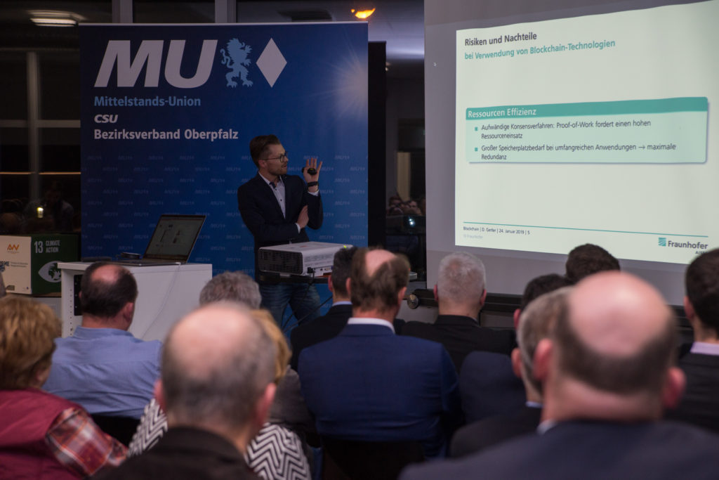 Den Abschluss der Vorträge machte Dominik Gertler, IT-Sicherheitsexperte, wissenschaftlicher Mitarbeiter der OTH und momentan im Fraunhoferinstitut tätig. Er beleuchtete verständlich die Funktionsweise der Blockchain, die unter anderem die zu Grunde liegende Technologie von Kryptowährungen wie Bitcoin ist und beschrieb auch die Sicherheitsrisiken. Der IT-Experte gab aber auch anhand von Projektbeispielen, die das Fraunhoferinstitut in Zusammenarbeit mit Auftraggebern aus der Wirtschaft entwickelt hat, einen Ausblick darauf, wo die Blockchain-Technologie zukünftig Anwendung finden könnte und bereits findet . Mögliche Anwendungsfelder sind zum Beispiel im Materialfluss oder im Gesundheitswesen zu finden.