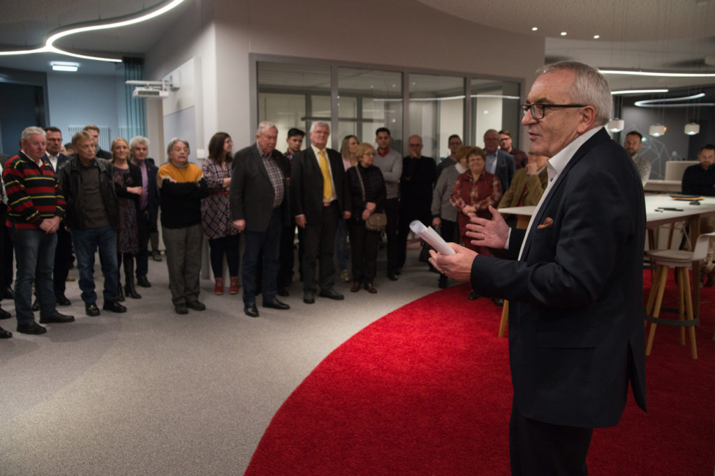 Zu Beginn der Veranstaltung nutzte Ludwig Zitzmann, Vorstandsvorsitzender der Sparkasse Oberpfalz Nord und Ideengeber für das Gebäude, die Gelegenheit um das e-house kurz vorzustellen. Neben der Sparkasse, die die Räumlichkeiten im Erdgeschoss für ihre digitale Beratungseinheit „S@ON“ nutzt, stehen die Flächen im ersten Stock der OTH Amberg-Weiden zur Verfügung. Die weiteren Stockwerke des sechsstöckigen Gebäudes werden u.a. vom Fraunhoferinstitut genutzt. „Mit dem e-house wollen wir eCommerce und Digitalisierung in der Region verankern“, so Zitzmann. Bei einer kurzen Besichtigung konnten sich alle Anwesenden ein Bild vom innovativen Raumkonzept machen, das die Sparkasse im Erdgeschoss entwickelt hat.